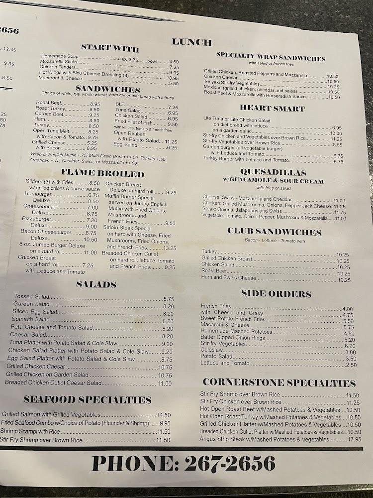 Dinner selections include grill specialties like burgers and seafood dishes, ensuring variety for all diners. Vegetarian options are also available, catering to those with dietary preferences. With affordable selections, Cornerstone thrives on quality and taste, making it a top choice for locals and visitors alike.